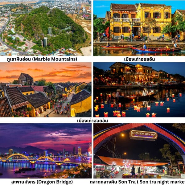 เดินทางถึงสนามบินดานัง (คนขับจะไปรอรับอยู่แล้ว) - ภูเขาหินอ่อน (Marble Mountains) ชมความงามของภูเขาหินอ่อน 5 ลูกที่ตั้งตระหง่านกลางเมืองดานัง สื่อถึงธาตุทั้งห้า - เมืองเก่าฮอยอัน เดินชมเมืองมรดกโลกที่เปี่ยมไปด้วยมนต์เสน่ห์ สะท้อนความรุ่งเรืองในอดีต - เดินทางกลับและเช็คอินที่โรงแรมในดานัง - สะพานมังกร (Dragon Bridge) ถ่ายรูปกับสัญลักษณ์ของเมืองดานัง สะพานรูปมังกรสีทองพาดผ่านแม่น้ำฮานอันสะดุดตา - สะพานแห่งความรักและ Dragon Carp แห่งดานัง จุดถ่ายภาพสุดโรแมนติกริมแม่น้ำฮาน - ตลาดกลางคืน Son Tra ( Son tra night market ) เดินชิลในตลาดกลางคืนสุดคึกคัก เลือกซื้อของกินเวียดนามแท้ๆ และของฝากท้องถิ่น - พักโรงแรมในดานัง