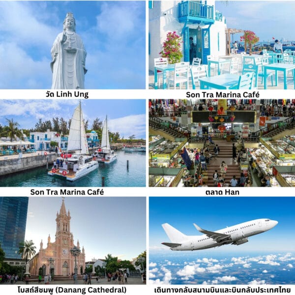 วัด Linh Ung สักการะพระพุทธรูปเจ้าแม่กวนอิมองค์ใหญ่ที่สุดในเวียดนาม บนเนินเขาแห่งคาบสมุทรเซินจ่าสถานที่เงียบสงบพร้อมวิวทะเล - Son Tra Marina Café คาเฟ่วิวทะเลสุดหรูที่กำลังเป็นจุดเช็กอินยอดนิยมของดานัง จิบกาแฟพร้อมชมวิวทะเลและท่าเรือหรูสไตล์ยุโรป - ตลาด Han แหล่งช้อปปิ้งใจกลางเมืองดานัง - โบสถ์สีชมพู (Danang Cathedral) ชมโบสถ์สไตล์โกธิกที่มีเอกลักษณ์โดดเด่นด้วยสีชมพูหวาน เป็นจุดถ่ายภาพยอดนิยมของนักท่องเที่ยว - เดินทางกลับสนามบินและบินกลับประเทศไทย
