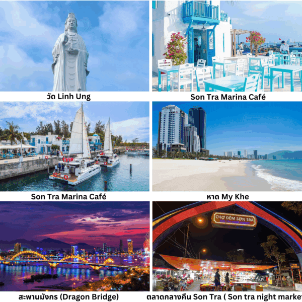 วัด Linh Ung สักการะพระพุทธรูปเจ้าแม่กวนอิมองค์ใหญ่ที่สุดในเวียดนาม บนเนินเขาแห่งคาบสมุทรเซินจ่าสถานที่เงียบสงบพร้อมวิวทะเล - Son Tra Marina Café คาเฟ่วิวทะเลสุดหรูที่กำลังเป็นจุดเช็กอินยอดนิยมของดานัง จิบกาแฟพร้อมชมวิวทะเลและท่าเรือหรูสไตล์ยุโรป - หาด My Khe หนึ่งในชายหาดที่สวยที่สุดของเวียดนามและเอเชีย ด้วยแนวชายหาดยาวกว่า 10 กิโลเมตร เม็ดทรายขาวสะอาด น้ำทะเลสีฟ้าใส - สะพานมังกร (Dragon Bridge) ถ่ายรูปกับสัญลักษณ์ของเมืองดานัง – สะพานรูปมังกรสีทองพาดผ่านแม่น้ำฮานอันสะดุด - สะพานแห่งความรักและ Dragon Carp แห่งดานัง จุดถ่ายภาพสุดโรแมนติกริมแม่น้ำฮาน - ตลาดกลางคืน Son Tra ( Son tra night market ) เดินชิลในตลาดกลางคืนสุดคึกคัก เลือกซื้อของกินเวียดนามแท้ๆ และของฝากท้องถิ่น - พักโรงแรมในดานัง