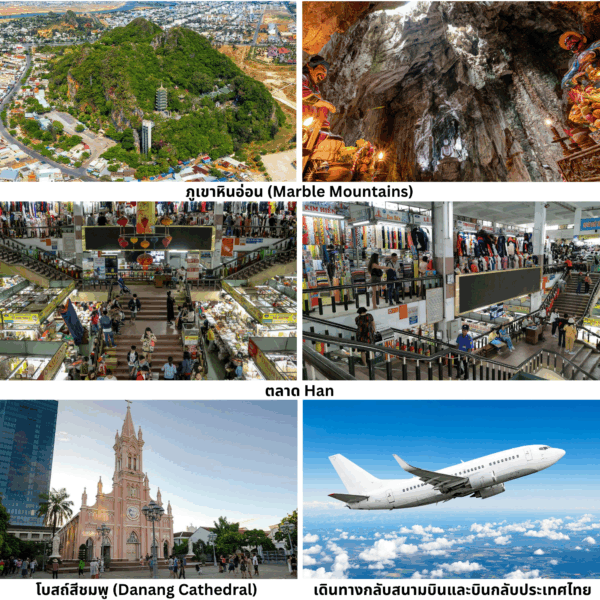 ภูเขาหินอ่อน (Marble Mountains) ชมความงามของภูเขาหินอ่อน 5 ลูกที่ตั้งตระหง่านกลางเมืองดานัง สื่อถึงธาตุทั้งห้า - ตลาด Han แหล่งช้อปปิ้งใจกลางเมืองดานัง - โบสถ์สีชมพู (Danang Cathedral) ชมโบสถ์สไตล์โกธิกที่มีเอกลักษณ์โดดเด่นด้วยสีชมพูหวาน เป็นจุดถ่ายภาพยอดนิยมของนักท่องเที่ยว - เดินทางกลับสนามบินและบินกลับประเทศไทย