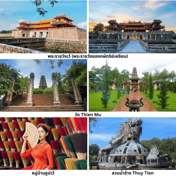 เมืองเว้ ออกเดินทางจากดานังสู่เมืองเว้ เมืองหลวงเก่าของเวียดนามในยุคราชวงศ์เหงียน เต็มไปด้วยวัฒนธรรม ประวัติศาสตร์ และบรรยากาศสงบงามริมแม่น้ำหอม - พระราชวังเว้ (พระราชวังของกษัตริย์เหงียน) โบราณสถานสำคัญกลางเมืองเว้ ที่เคยเป็นพระราชวังหลวงของราชวงศ์เหงียน และลวดลายสถาปัตยกรรมแบบเวียดนามดั้งเดิม - เที่ยวชม วัด Thien Mu พร้อมวิวแม่น้ำ เจดีย์เก่าแก่ริมแม่น้ำหอม สัญลักษณ์ทางศาสนาที่สำคัญของเมืองเว้ - หมู่บ้านธูปเว้ หมู่บ้านที่ขึ้นชื่อเรื่องการทำธูปด้วยมือในสีสันสดใส นักท่องเที่ยวสามารถชมขั้นตอนการผลิตธูป - สวนน้ำร้าง Thuy Tien จุดถ่ายรูปแนวลึกลับที่โด่งดังในโลกออนไลน์ กับโครงสร้างสวนน้ำเก่าที่ถูกทิ้งร้างบรรยากาศแปลกตาและน่าค้นหา